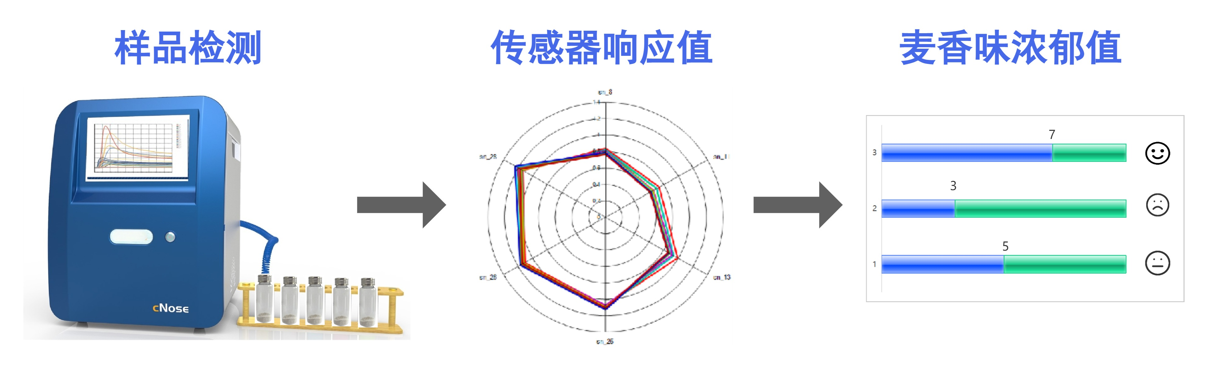 1、高灵敏度电子鼻传感器列阵,精准捕捉旱碱麦中麦香味挥发性物质的“气味指纹”,响应性高、稳定性强、重复性好。